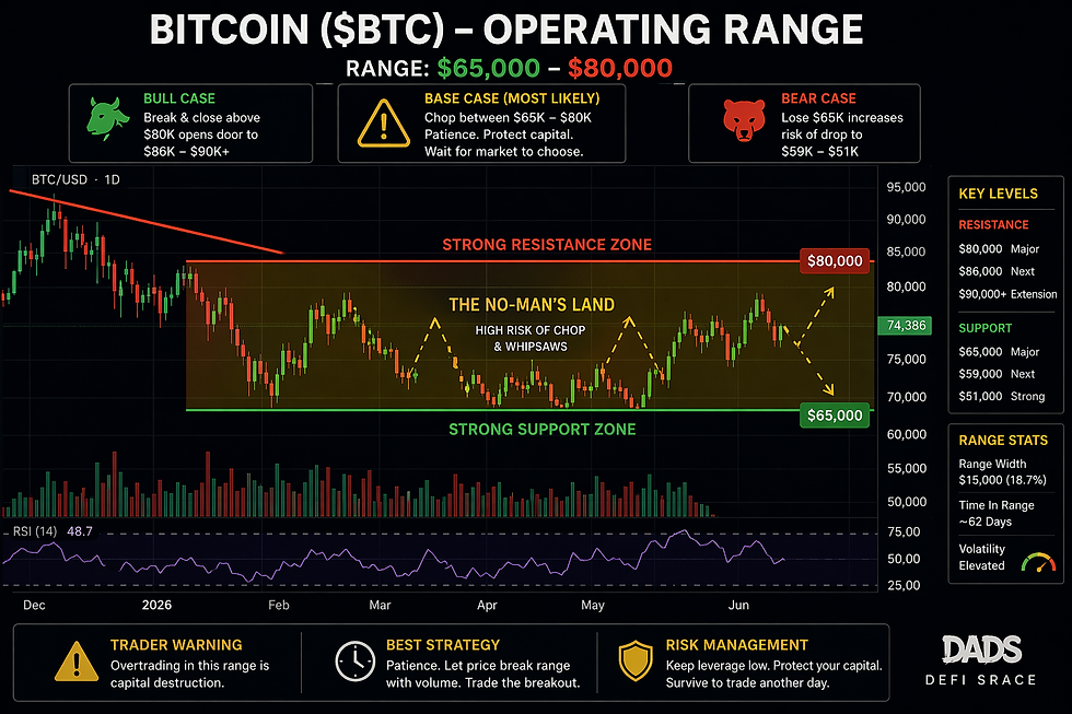 Even though your earlier draft used lower spot numbers, the broader technical thesis still holds up well: BTC is trading inside a key operating range of roughly $65K to $80K, and this middle section is exactly where traders tend to get chewed up if they start forcing conviction too early.
